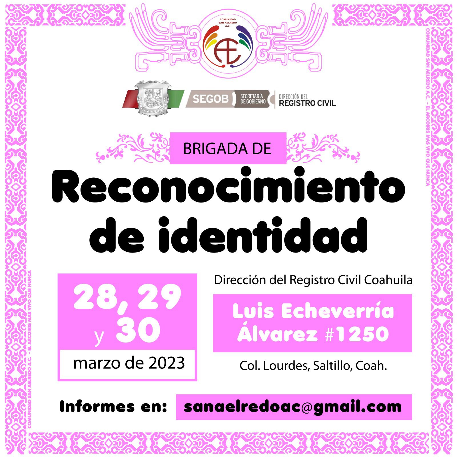 Cómo parte de las acciones para dar certeza jurídica a la población transgénero en Saltillo, la Comunidad San Aelredo AC. convoca a las personas que se identifican con esta orientación sexual a participar en una campaña de reconocimiento de identidad para contar con un documento oficial expedido por el Gobierno del Estado y dar certidumbre en los aspectos laboral, estudiantil, social, familiar y amistades. para que su integración social sean una realidad en este 2023.
