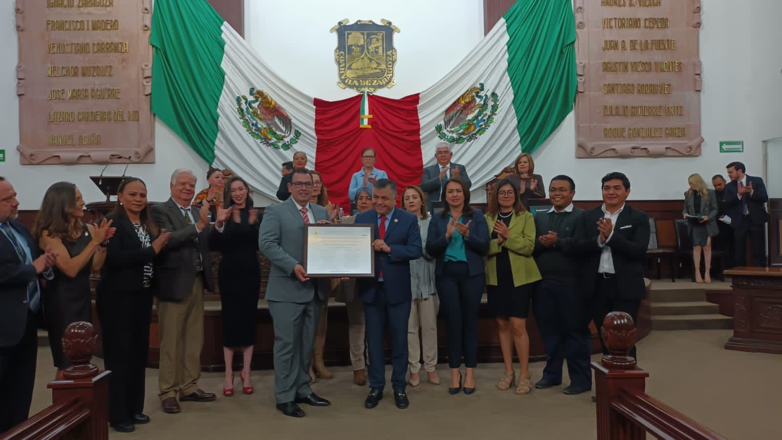 El Diputado Eduardo Olmos Castro, Presidente de la Junta de Gobierno, entregó una placa de reconocimiento a esta institución educativa por conducto de su director, Alfonso Yañez Arreola, con la siguiente leyenda: “Por su histórica tarea de armonizar y equilibrar la convivencia social y política mediante la aplicación del derecho, y por su compromiso con los valores éticos que caracterizan la verdad y la justicia, las Diputadas y los Diputados de la Sexagésima Segunda Legislatura declaran a: La Facultad de Jurisprudencia de la Universidad Autónoma de Coahuila, como Patrimonio Cultural Intangible del Estado de Coahuila de Zaragoza. La placa la suscriben la totalidad de las Diputadas y los Diputados.
