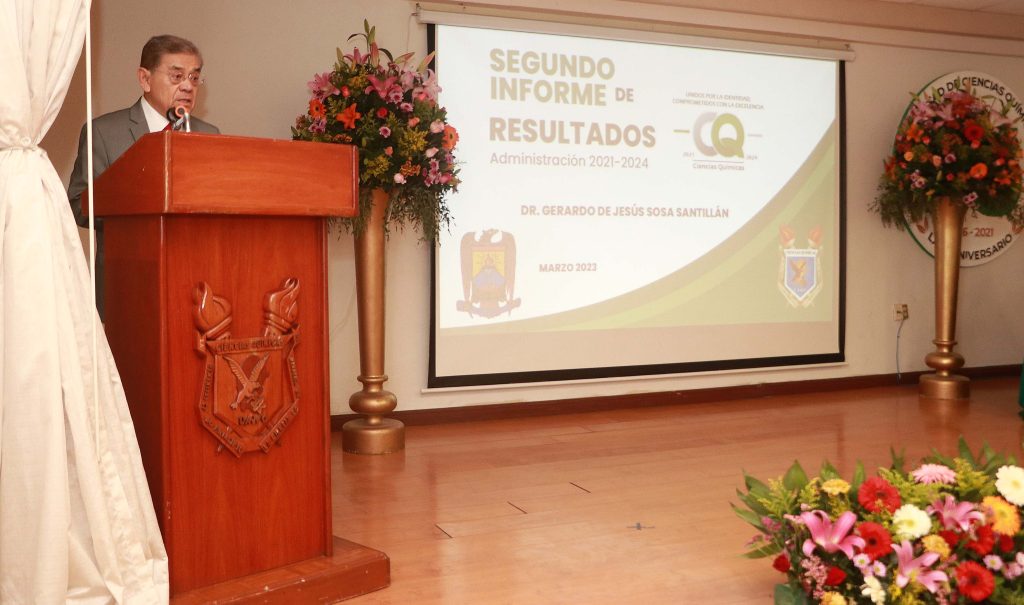 El director de la Facultad de Ciencias Químicas, de la Universidad Autónoma de Coahuila, Dr. Gerardo de Jesús Sosa Santillán, presentó ante el consejo directivo y comunidad universitaria del plantel, su segundo informe de actividades correspondiente al periodo 2022-2023.