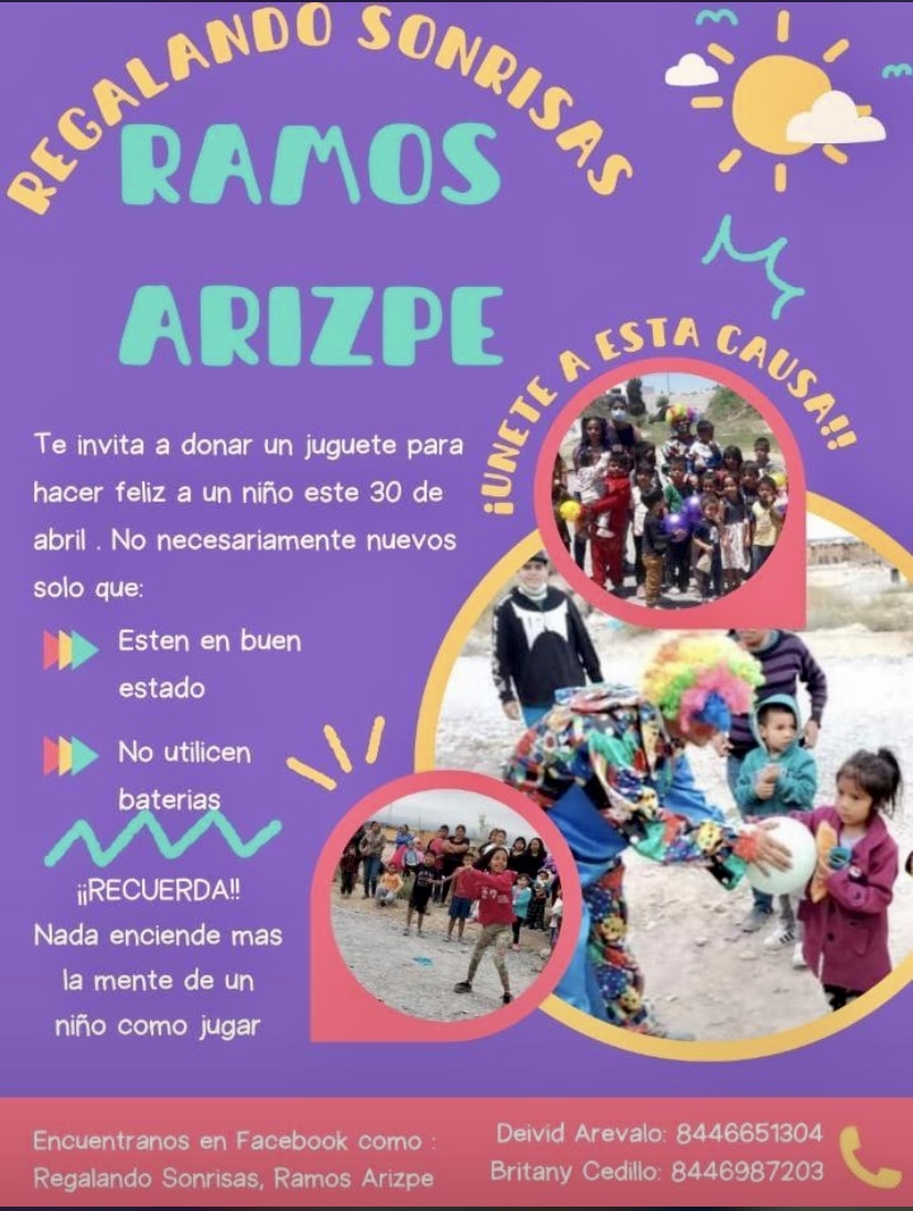 La comunidad de jóvenes ramosarizpenses ‘Regalando Sonrisas’ solicita el apoyo de la población para participar en una colecta de juguetes no bélicos y en buen estado, con el objetivo de que el 30 de abril, sean entregados a niños y niñas de escasos recursos que habitan en la zona poniente de Ramos Arizpe, lo anterior en el marco del Día del Niño.