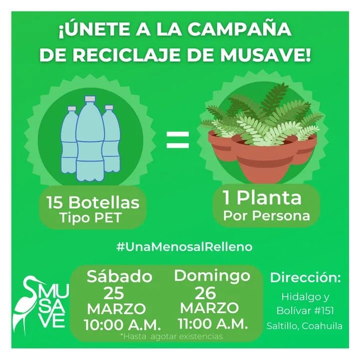 El Museo de las Aves invitó a los saltillenses a participar en la campaña de reciclaje que se realizará este sábado 25 y domingo 26 de marzo en instalaciones de ese recinto museográfico, donde se estará regalando una planta suculenta por cada 15 botellas de PET que entreguen los asistentes, mismas que deberán estar preferentemente secas y limpias al momento de entregarse.