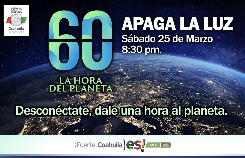 Este sábado, a partir de las 20:30 horas, Coahuila se sumará a la Hora del Planeta, con el apagado de luces en edificios del Gobierno del Estado, parques recreativos e instituciones de Educación Superior de Saltillo.