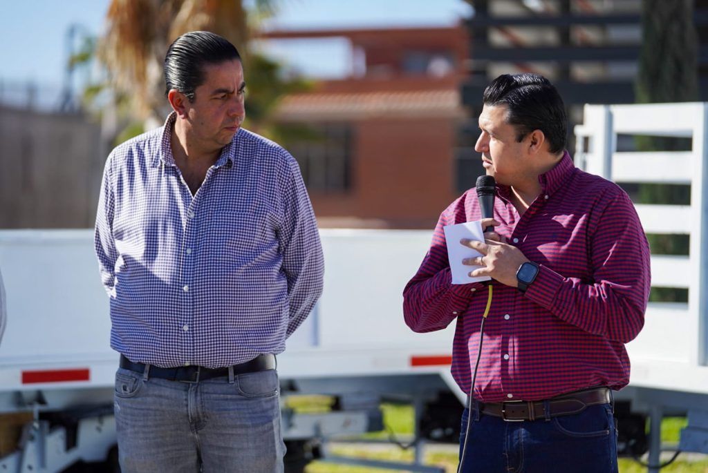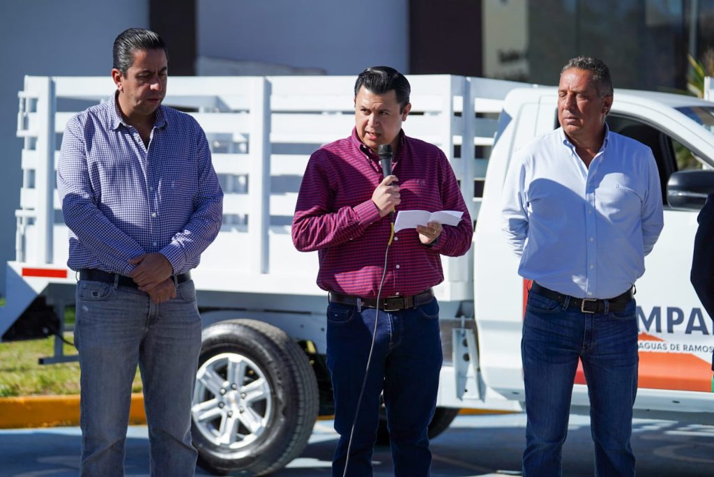 El alcalde Chema Morales Padilla encabezó la entrega de las camionetas S10 modelo 2023, acondicionadas con plataforma, con las que se reforzarán las tareas diarias de instalación de medidores, inspecciones domiciliarias, reparación de fugas, supervisión de obras, así como la vigilancia de las fuentes de abastecimiento de agua potable ubicadas en la zona urbana y rural.
