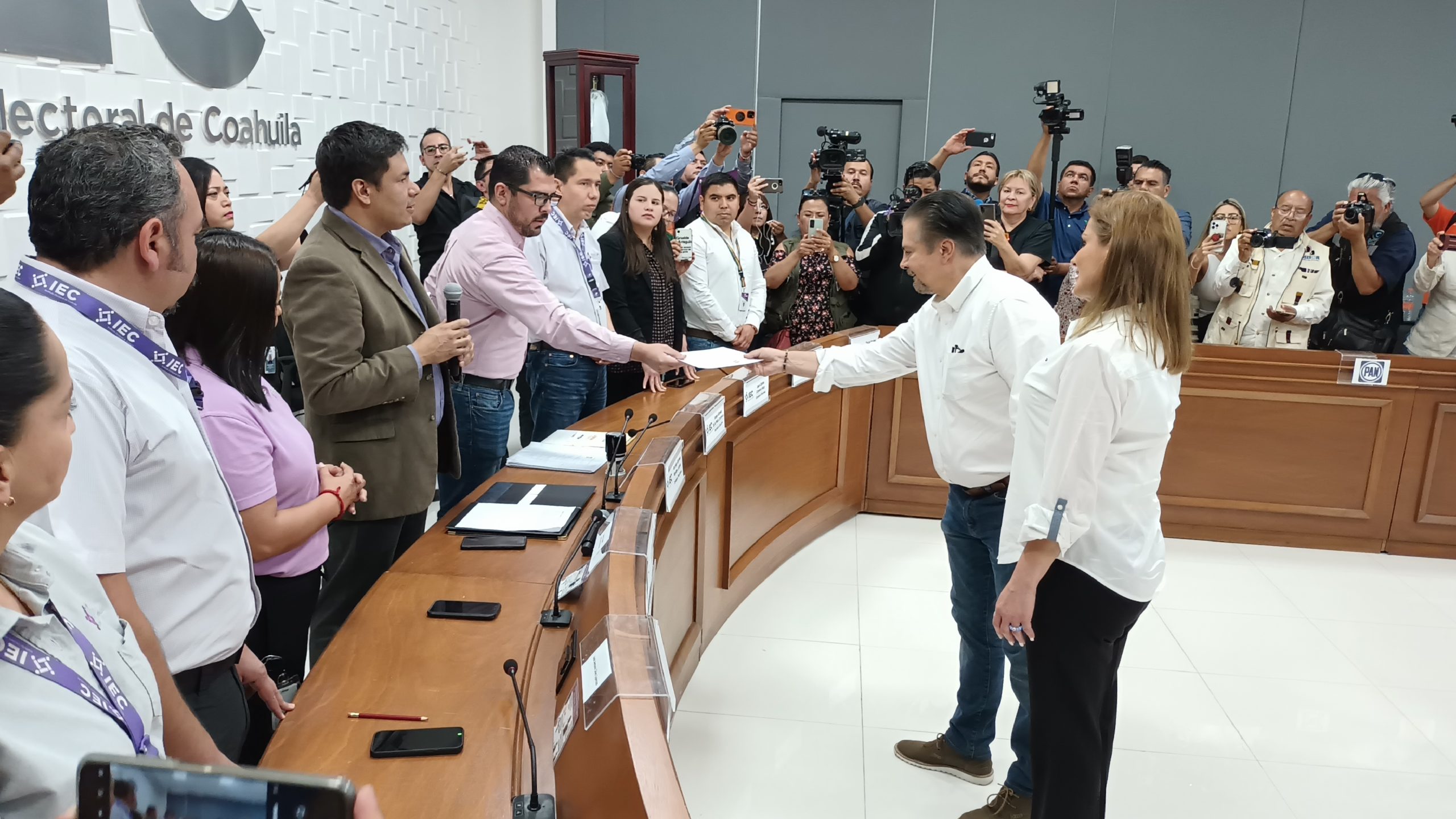 “Para nosotros tiene que ser un día sumamente importante y trascendental. Nosotros en la izquierda responsable de Coahuila hemos estado en la lucha histórica por la alternancia democrática de este estado. Coahuila es un pueblo libre, valiente, hijo de revolucionarios como Madero, Carranza, que está listo para enarbolar las banderas de la libertad y la democracia”, dijo el candidato de UDC en un breve mensaje tras solicitar su registro. (ÁNGEL AGUILAR)