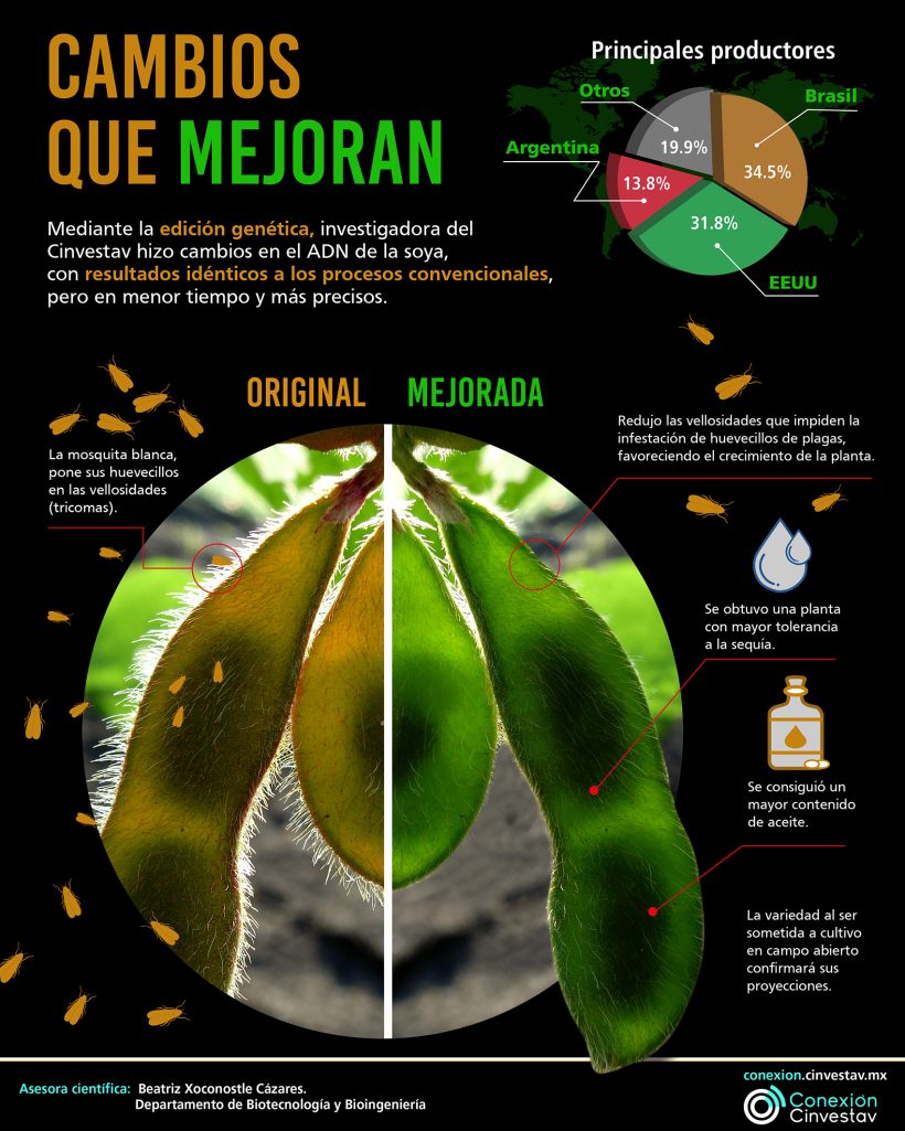 Con el objetivo de mejorar su rendimiento y calidad, el grupo científico liderado por Beatriz Xoconostle Cázares, investigadora del Departamento de Biotecnología y Bioingeniería del Cinvestav, desarrolló algunas variedades de soya capaces de inhibir la acción de su principal plaga: la mosquita blanca, además de presentar una mayor tolerancia a la sequía.