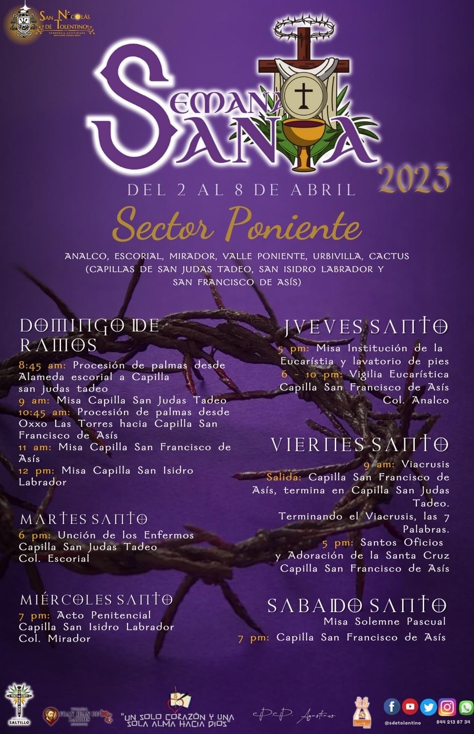 El párroco de San Nicolás de Tolentino, Francisco Peña Flores, informó que el 2 de abril, Domingo de Ramos, se iniciará a las 8:45 horas con la Procesión de Palmas desde la Alameda Escorial a la Capilla San Judas Tadeo, lugar en dónde en punto de las 9:00 horas se llevará a cabo la misa solemne para dar paso a las 10:45 horas a la Procesión de Palmas desde el Oxxo Las Torres hacia la Capilla San Francisco de Asís, dónde se celebrará una misa en punto de las 11:00 horas, y finalmente se efectuará una última misa a las 12:00 horas en la Capilla San Isidro Labrador.