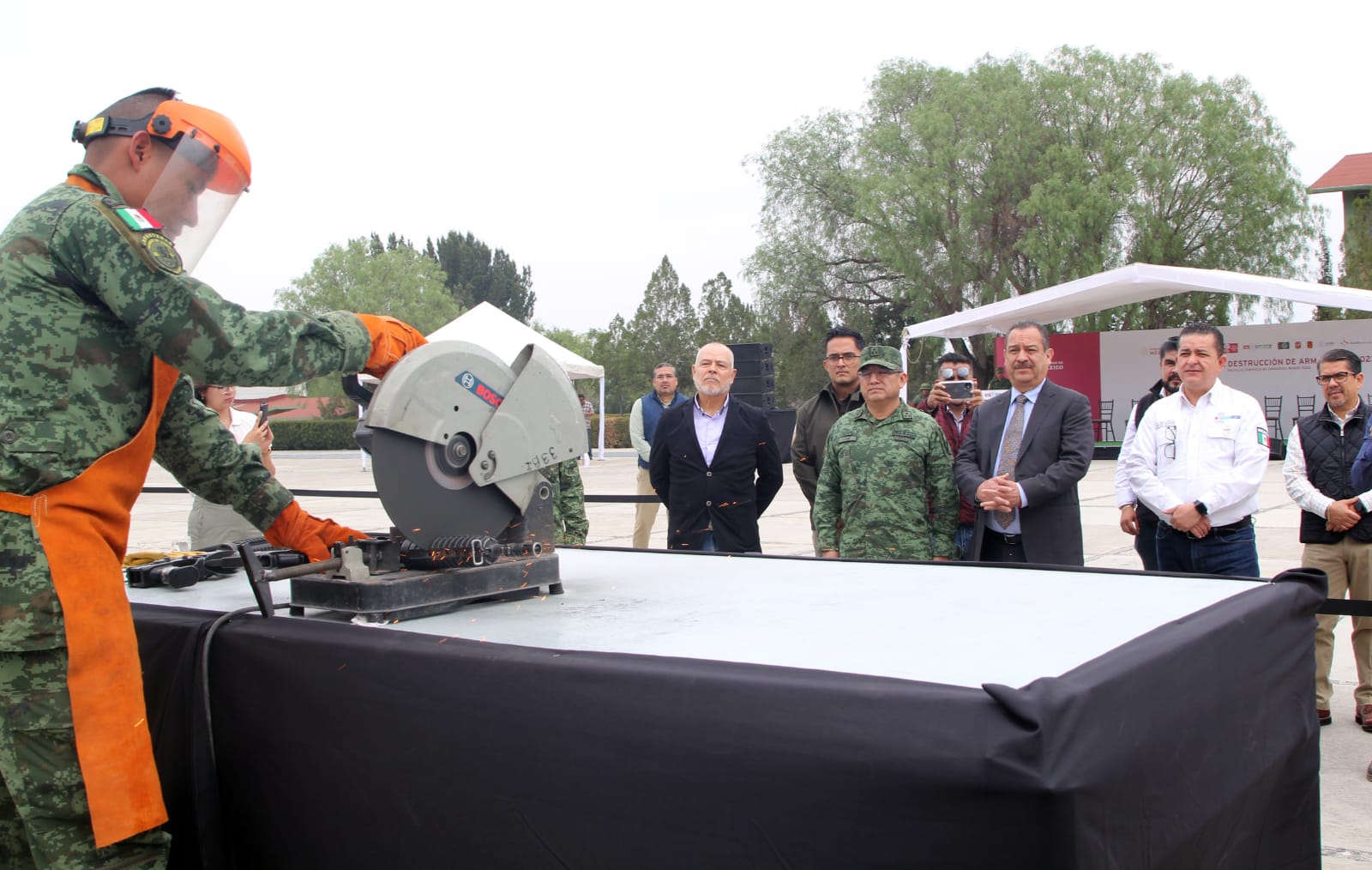 Las autoridades militares, destruyeron 264 armas largas; 294 cortas; 11 mil 896 cartuchos y 385 cargadores, mediante su corte con esmeriles eléctricos.