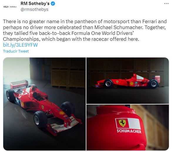 #AuctionUpdate Fasten your seatbelts! The Michael Schumacher Monaco Grand Prix-Wining @Ferrari Formula 1 Racing Car roars past its estimate, selling for $7.5 million – setting a record for a modern era Formula One car @RMSothebys pic.twitter.com/eOZI9E11bI