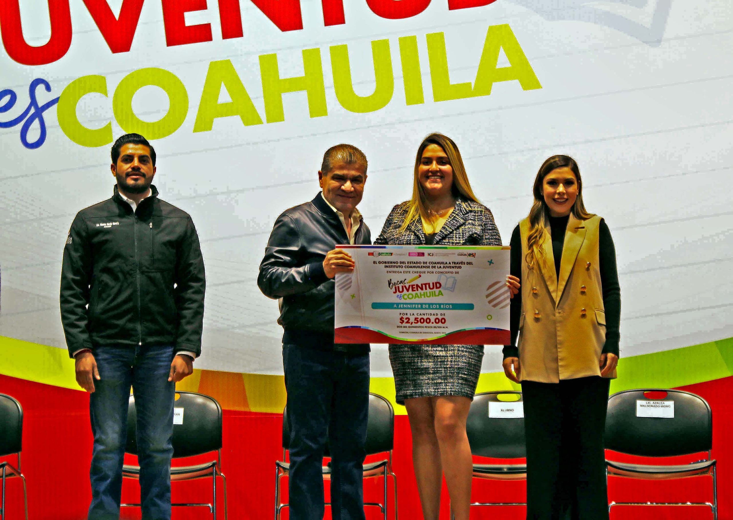 Mientras que la titular del Instituto Coahuilense de la Juventud «ICOJUVE», Azalea Maldonado Wong, dijo que con esta beca se reconoce por su esfuerzo y empeño a 900 jóvenes universitarios de universidades públicas y privadas de la Región Sureste de Coahuila y explicó que en todo el estado son 3 mil estudiantes los que han sido beneficiados.