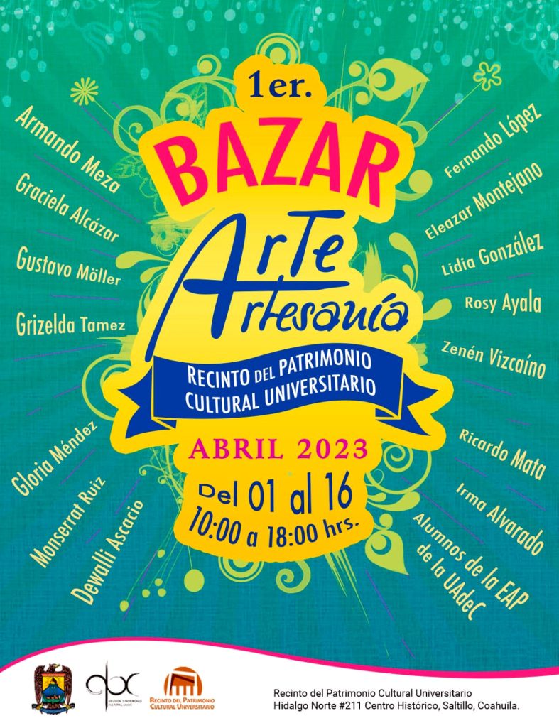 La Universidad Autónoma de Coahuila a través de la Coordinación General de Difusión y Patrimonio Cultural (DPC), invitan a la comunidad universitaria y público en general al “Primer Bazar ArteArtesanía” que se llevará a cabo del 1 al 16 de abril, de 10:00 a 18: horas, en el Recinto del Patrimonio Cultural Universitario, ubicado en Hidalgo Norte 211 en el Centro Histórico de Saltillo.
