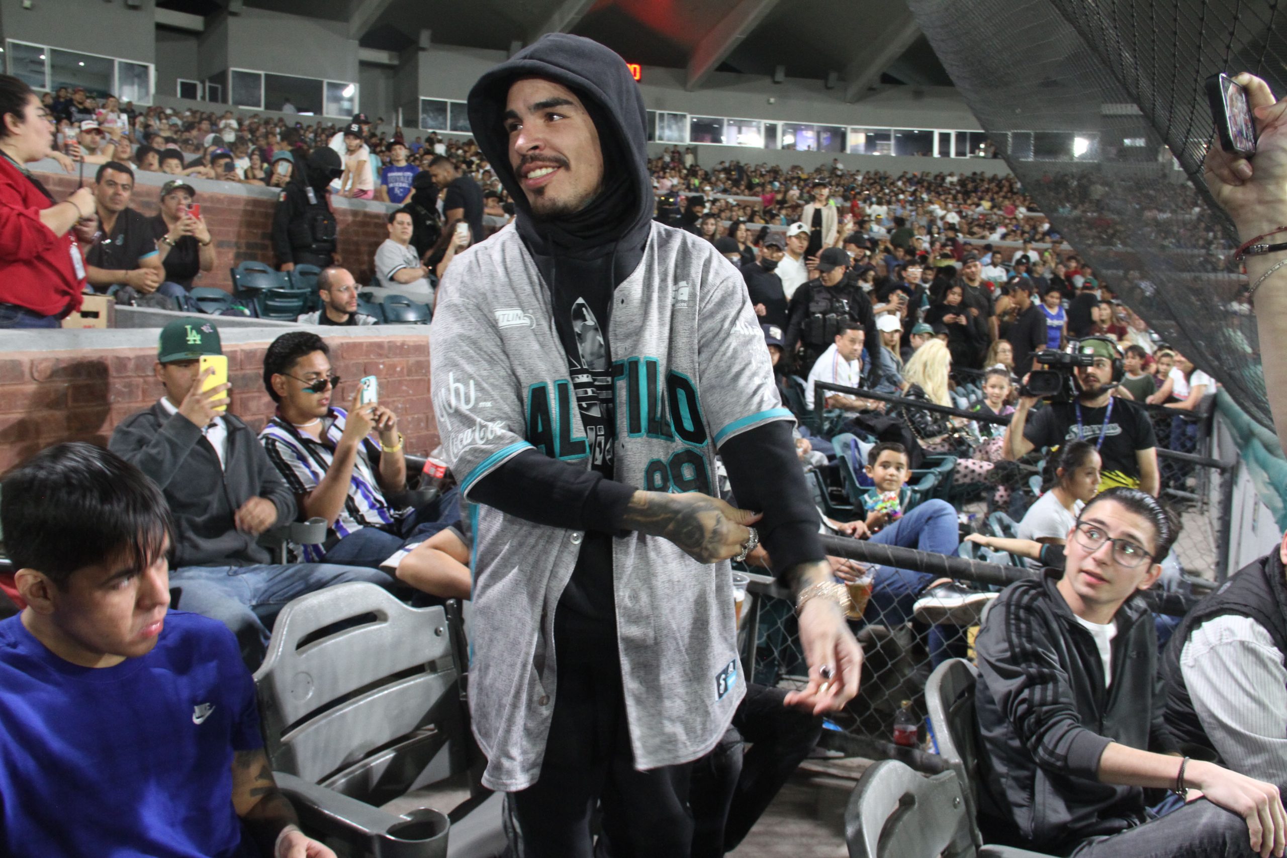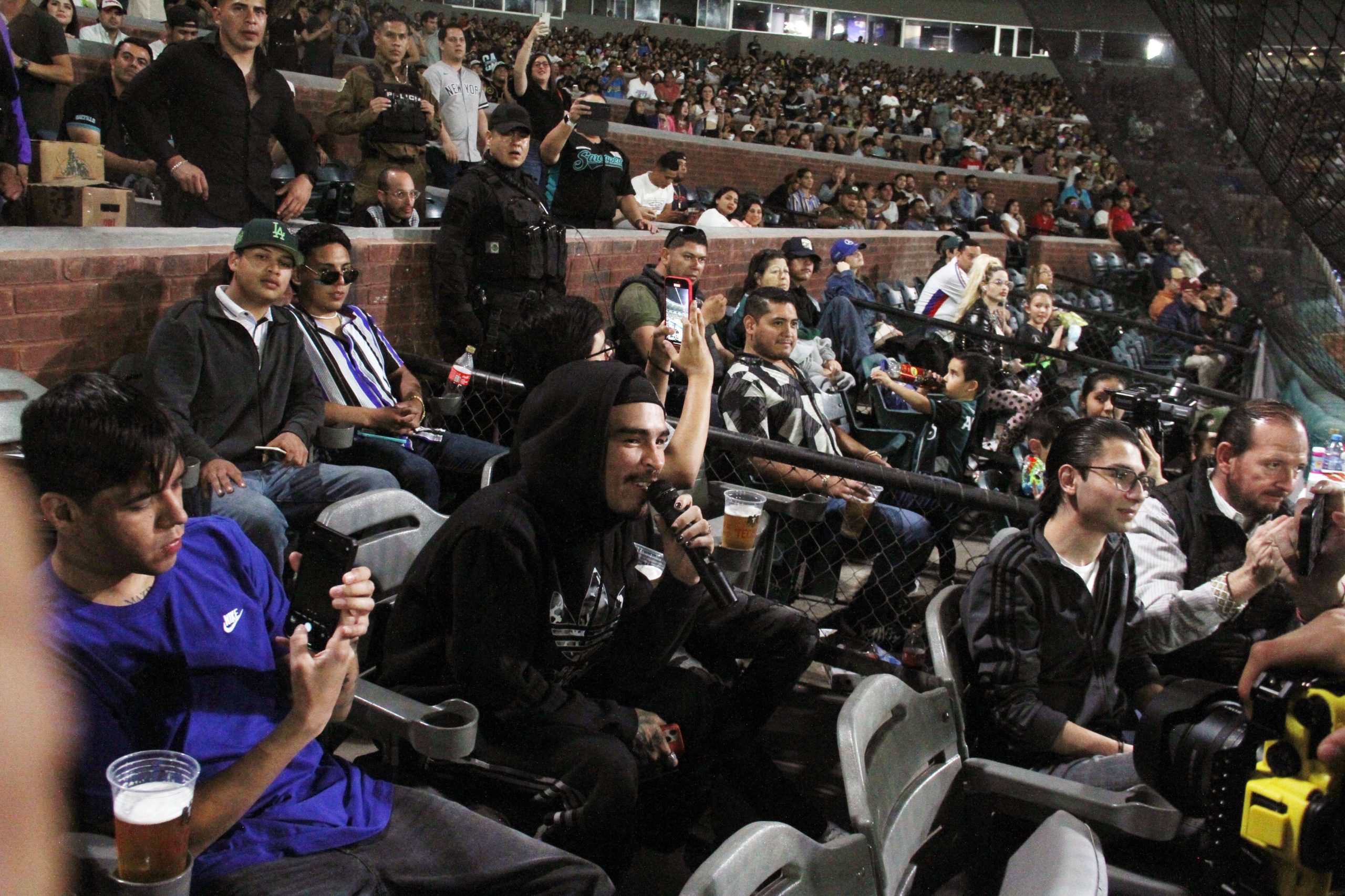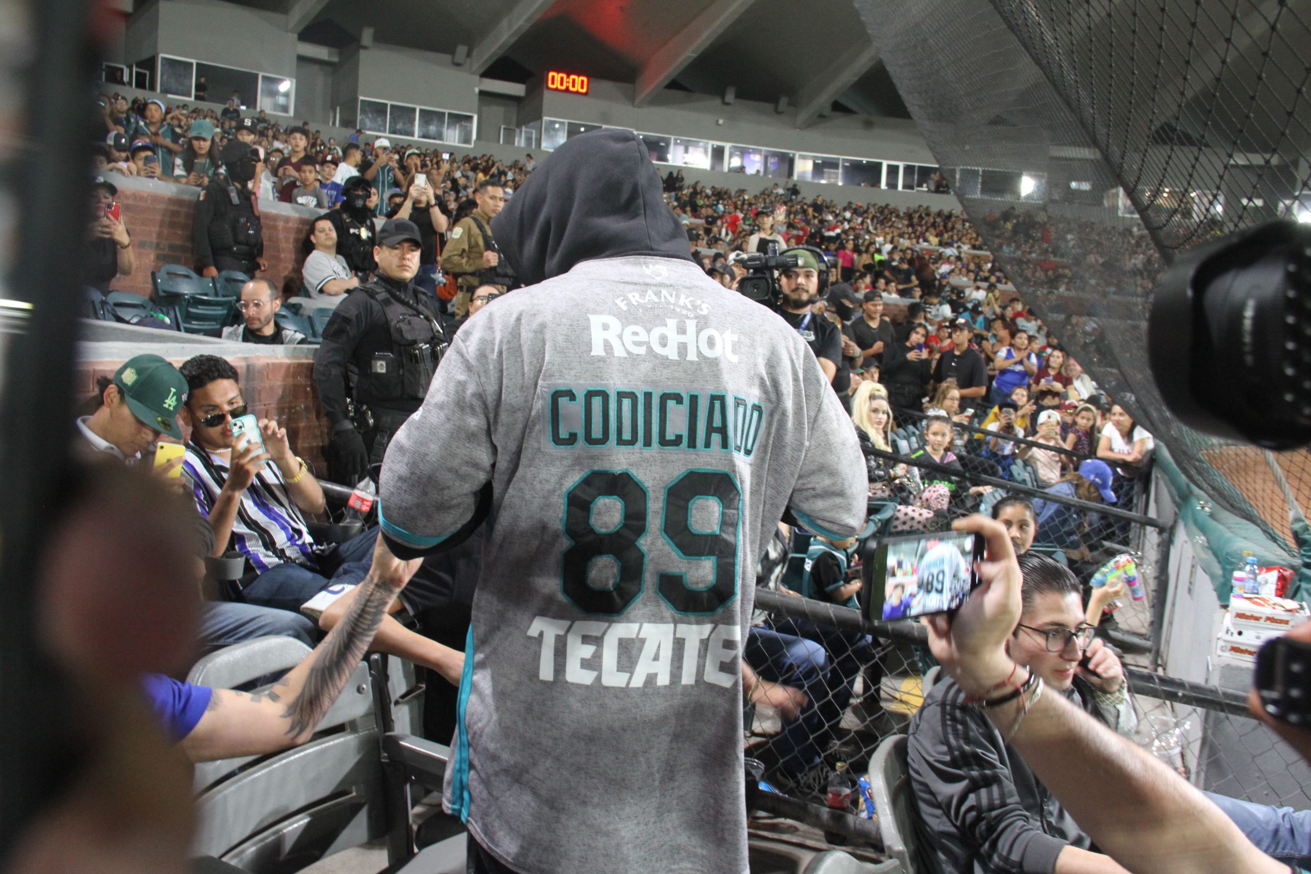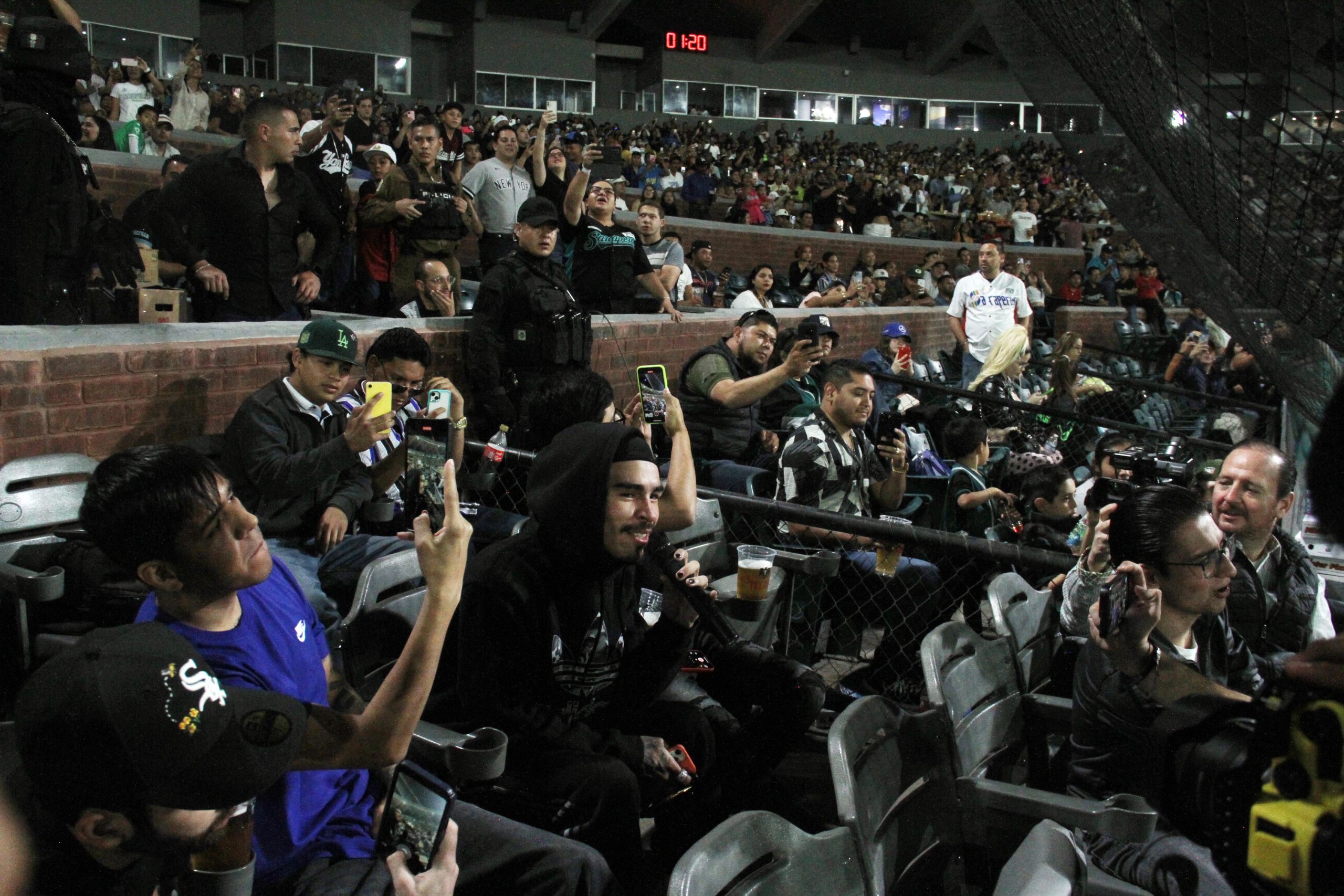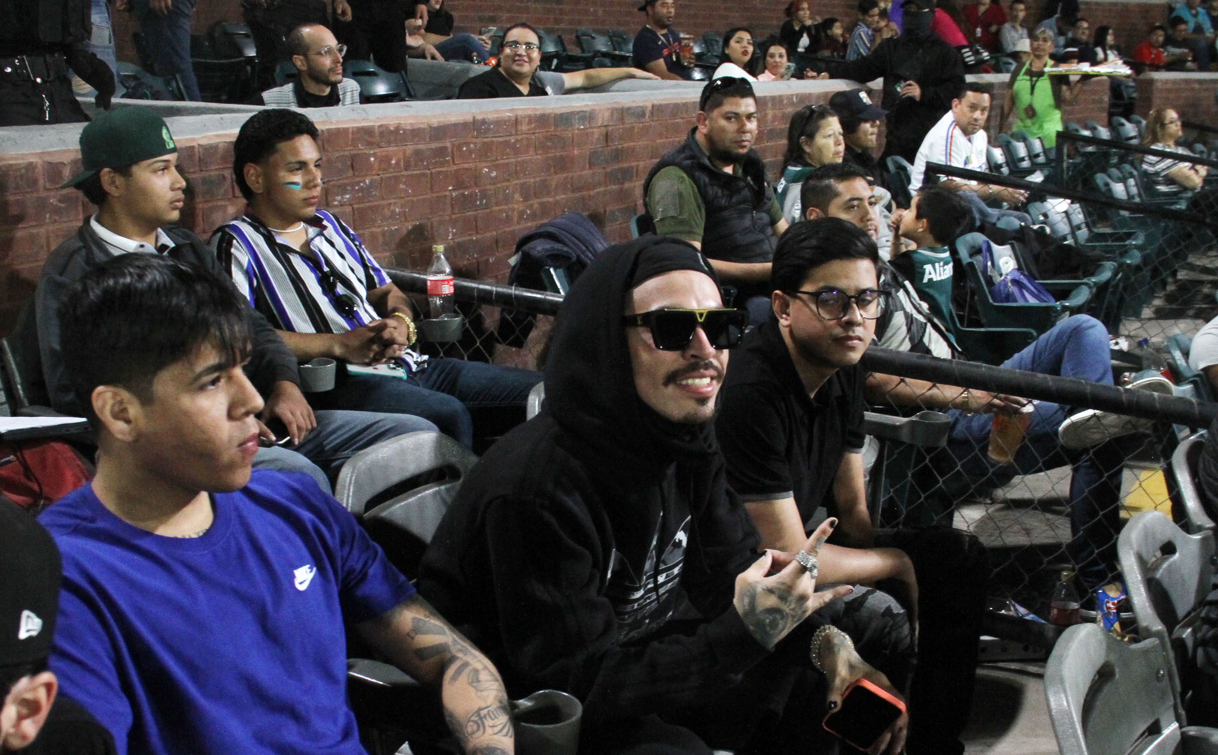 El sonido local los presentó en la octava entrada, cuando Érick Aragón tomó el micrófono para interpretar a capela uno de sus éxitos, apoyado por el coro de la mejor afición de México, los 9 mil aficionados que se dieron cita en el estadio para sellar una gran noche de béisbol y la presencia de lujo de Codiciado. (FERNANDO VALDÉS/SARAPEROS)