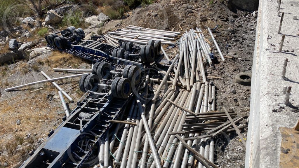 El operador de un transporte de carga sufrió una falla en el sistema de frenos y volcó al interior de un arroyo, ubicado a un costado de la carretera 57, en el tramo Los Chorros.