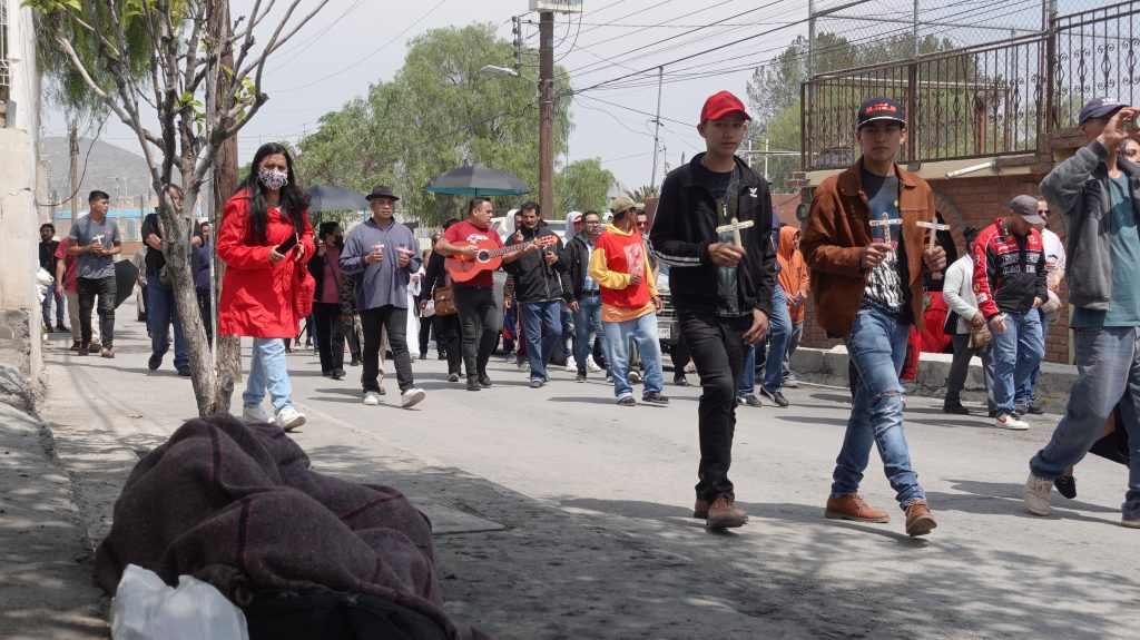 Alguien carga una bocina, desde la que suena una canción de Ricardo Arjona que reza “Si la visa universal se extiende el día en que nacemos y caduca en la muerte ¿Por qué te persiguen, mojado? Si el cónsul de los cielos, ya te dio permiso”, el mensaje se cuela en los oídos de los migrantes, quienes permanecen atentos a la misión de acompañar simbólicamente a Jesús a su calvario en esta Semana Santa.