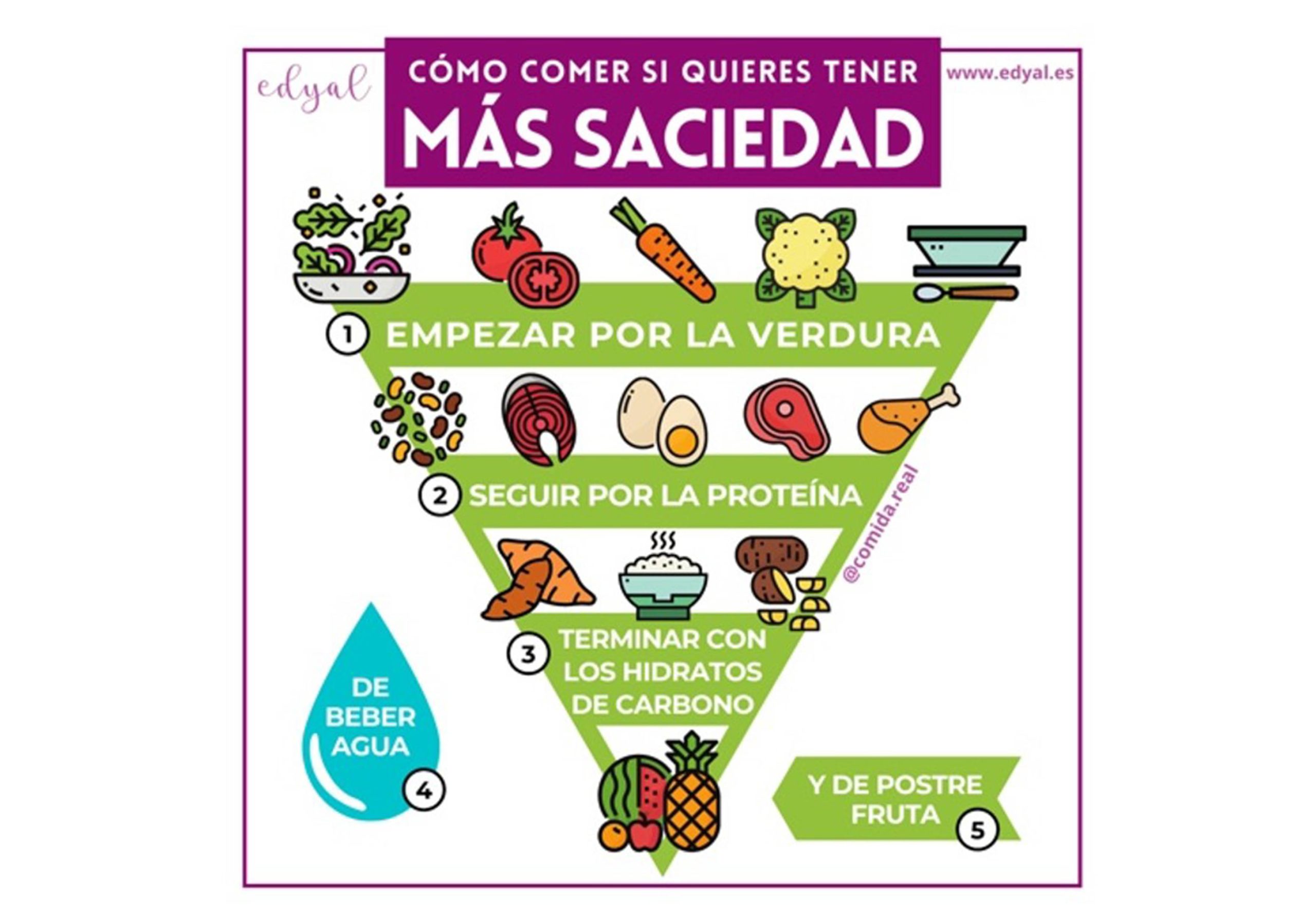 Para obtener mayor saciedad, sugirió una alimentación en forma de pirámide invertida, en donde en la parte más alta y ancha estarían las verduras, luego proteínas como carne y huevo, enseguida los carbohidratos (pan y arroz) y, al final, fruta como postre; todo acompañado de agua natural. (UNAM)