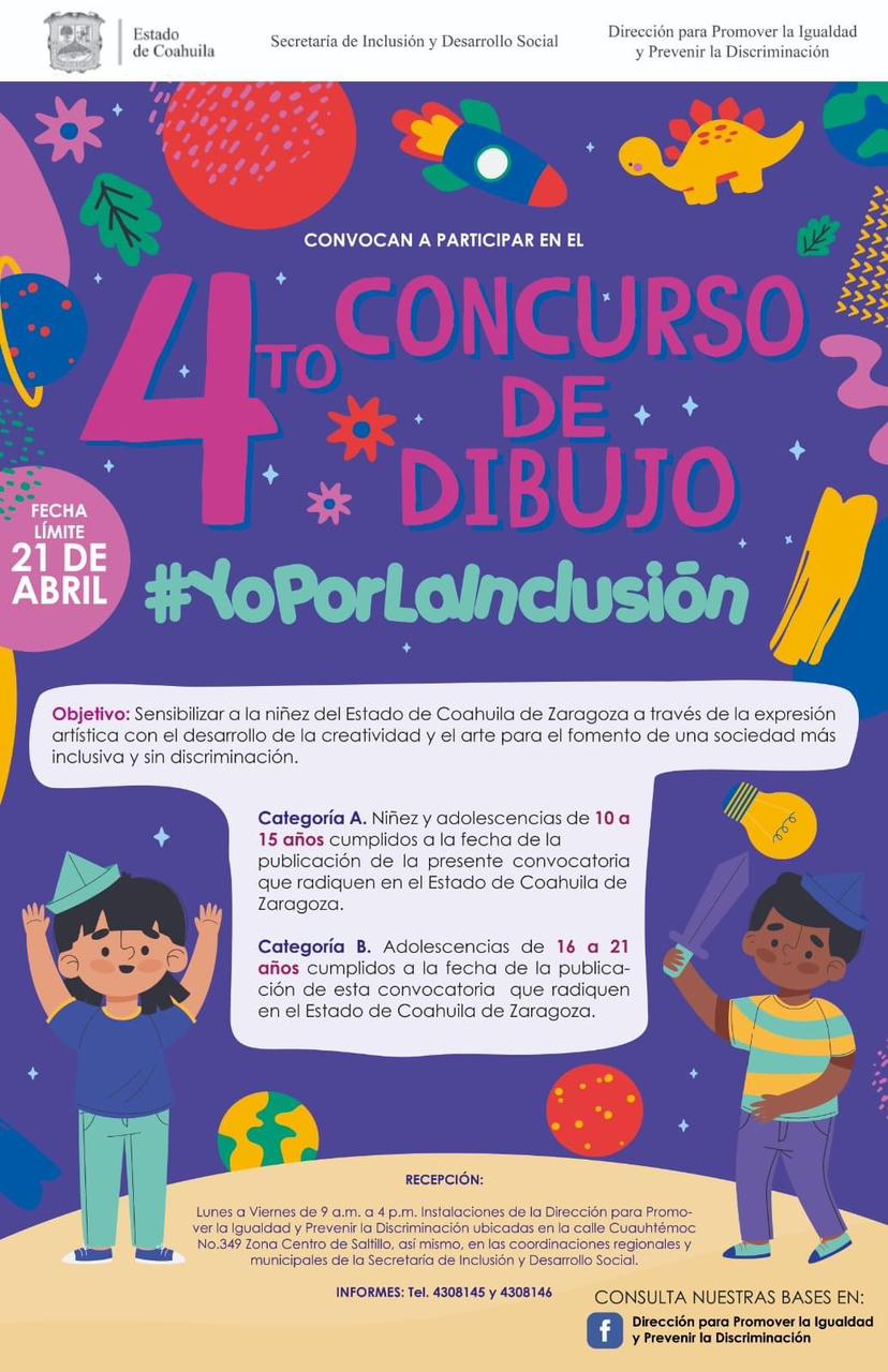 El Gobierno del Estado exhorta a la niñez y a la juventud de Coahuila a participar en el Cuarto Concurso de Dibujo #YoporLaInclusión, ya que la fecha límite para la entrega de los trabajos vence el próximo viernes 21 de abril.