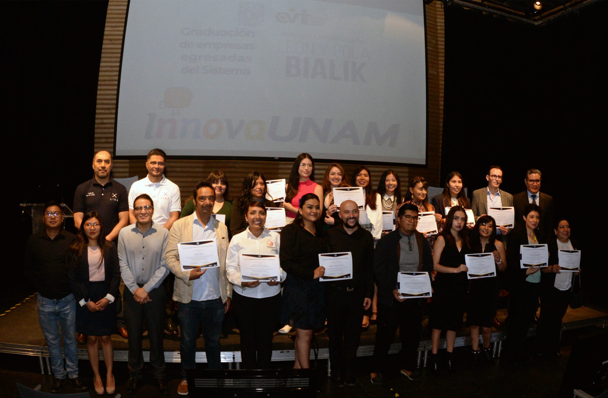 “Es importante que los universitarios consideren la opción de desarrollarse profesionalmente como emprendedores, una actividad que la Universidad ha venido impulsando desde hace varios años, especialmente a través de la Coordinación de Vinculación y Transferencia Tecnológica (CVTT)”, comentó al presidir la ceremonia de graduación de 21 empresas del Sistema InnovaUNAM, donde también se entregó el Premio Universitario León y Pola Bialik-InnovaUNAM.