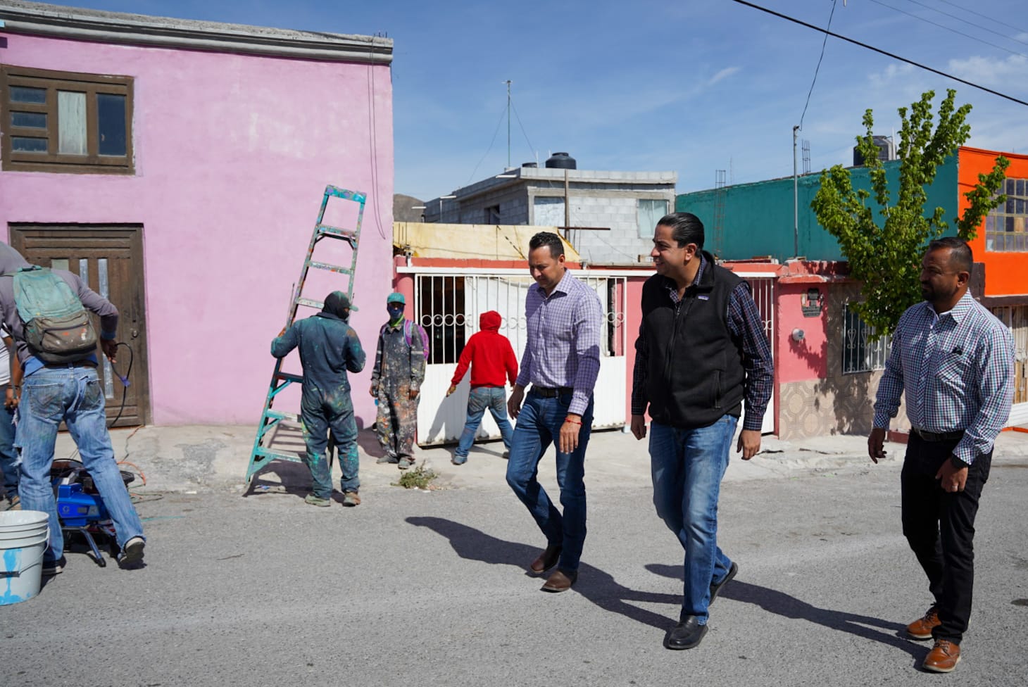 Durante un recorrido por el sector poniente de Ramos Arizpe, el alcalde Chema Morales Padilla supervisó los trabajos de embellecimiento de fachadas que se realiza en casas de la colonia “El Mirador”.