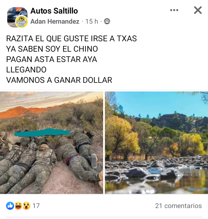 “Razita, el que guste irse a Texas ya saben, soy ‘El Chino’, pagan hasta estar allá, legando vamos a ganar dólares”, dice la publicación en Facebook.