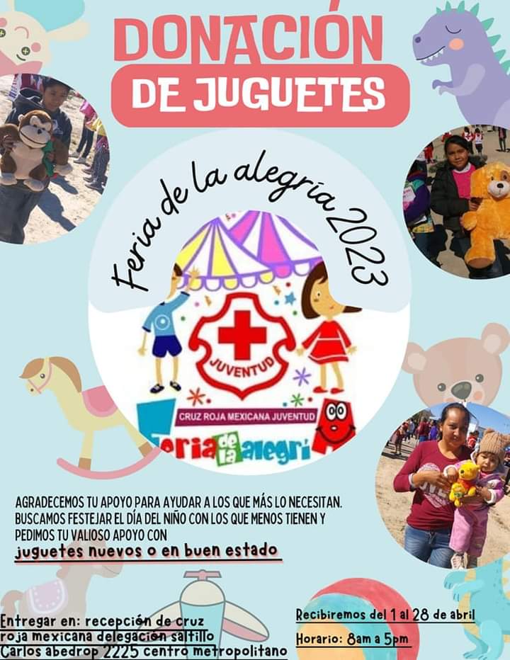 La Cruz Roja delegación Saltillo informó que durante este mes de abril se lleva a cabo la campaña de donación de juguetes nuevos o en buen estado, mismos que el próximo día 30 de abril, en el marco de la celebración del Día del Niño, serán entregados a los pequeños de escasos recursos del área rural.