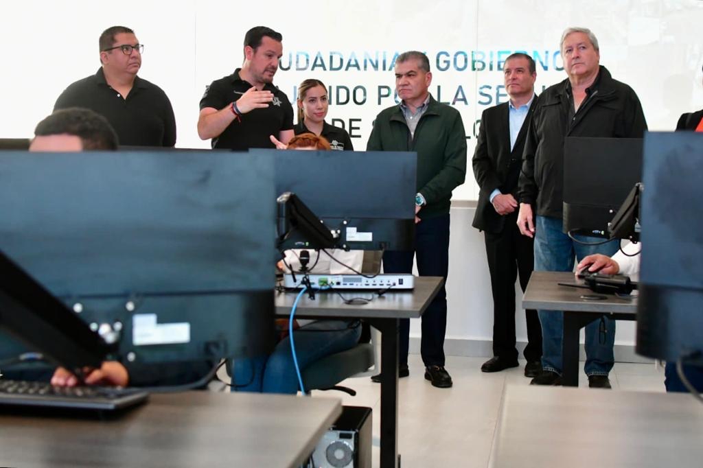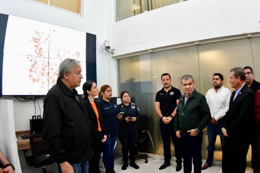 El gobernador Miguel Ángel Riquelme Solís y el alcalde José María Fraustro Siller realizaron un recorrido de supervisión por las instalaciones del Centro de Comunicación y Comando (C-2) que administra el municipio y que avanza en la interconexión al Sistema de Video Inteligencia Estatal C-4.
