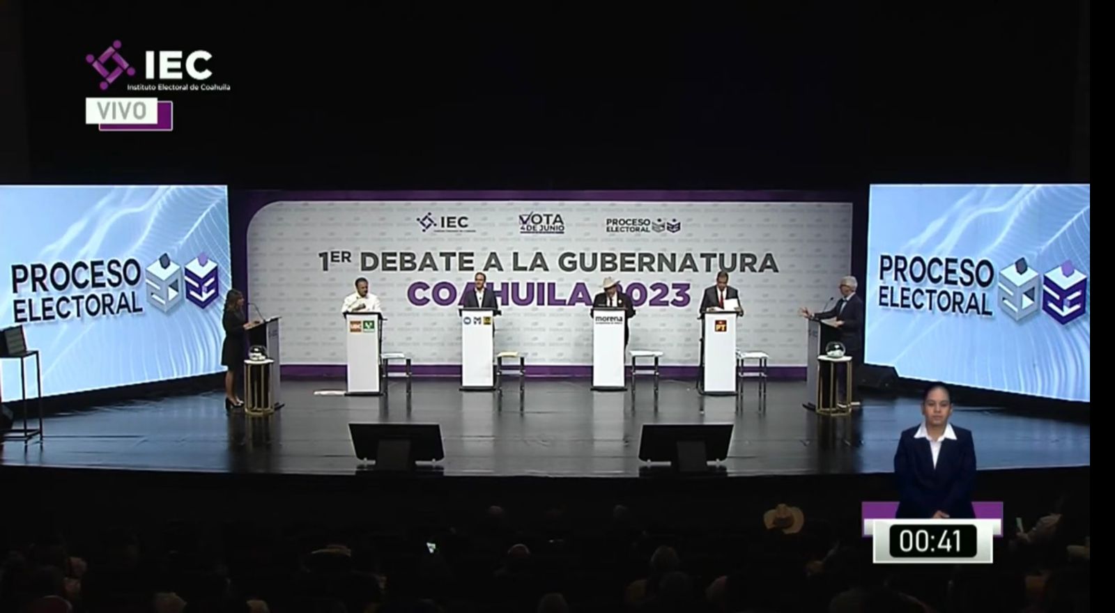 Este domingo tuvo lugar en la ciudad de Torreón el primer debate organizado por el Instituto Electoral de Coahuila (IEC) entre los candidatos a la gubernatura del estado, Manolo Jiménez Salinas, de la alianza PRI-PAN-PRD, Armando Guadiana, de MORENA, Ricardo Mejía Berdeja, del Partido del Trabajo (PT), y Lenin Pérez Rivera, de la coalición Partido Verde – UDC.