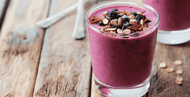 - Vierte la preparación en vasos de cristal y decora con los frutos y la granola.