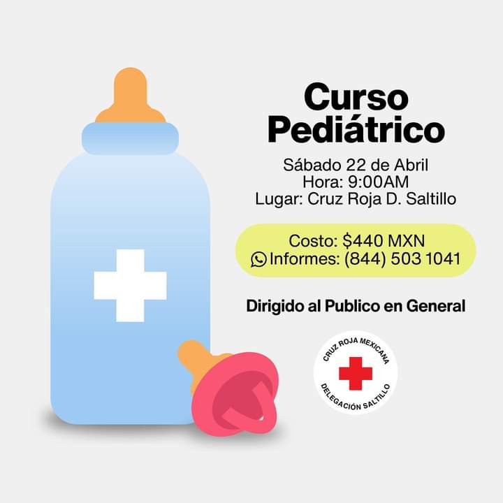 La delegación Saltillo de la Cruz Roja informó que este sábado 22 de abril tendrá lugar en esa institución el curso de primeros auxilios pediátricos dirigido al público en general, con el objetivo de ofrecer a los participantes los conocimientos necesarios para que sean capaces de actuar en caso de presentarse algún accidente o emergencia en menores de 0 a cinco años, y logren incluso salvar la vida de estos infantes.