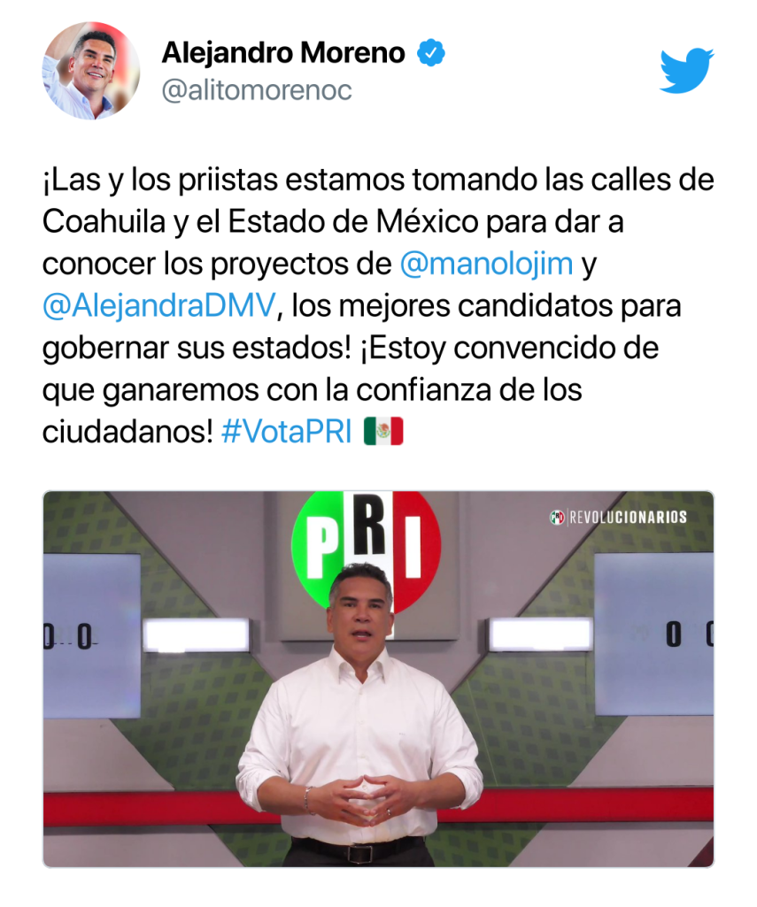 ¡Las y los priistas estamos tomando las calles de Coahuila y el Estado de México para dar a conocer los proyectos de @manolojim y @AlejandraDMV, los mejores candidatos para gobernar sus estados! ¡Estoy convencido de que ganaremos con la confianza de los ciudadanos! #VotaPRI 🇲🇽 pic.twitter.com/2neHxXkRLT
