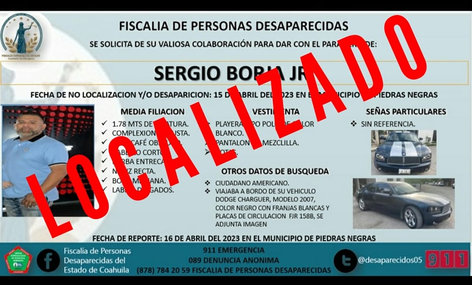 El ciudadano estadounidense, Sergio Borja Jr., que desapareció desde el sábado en la noche en la zona norte del estado de Coahuila, ya fue liberado por sus captores.