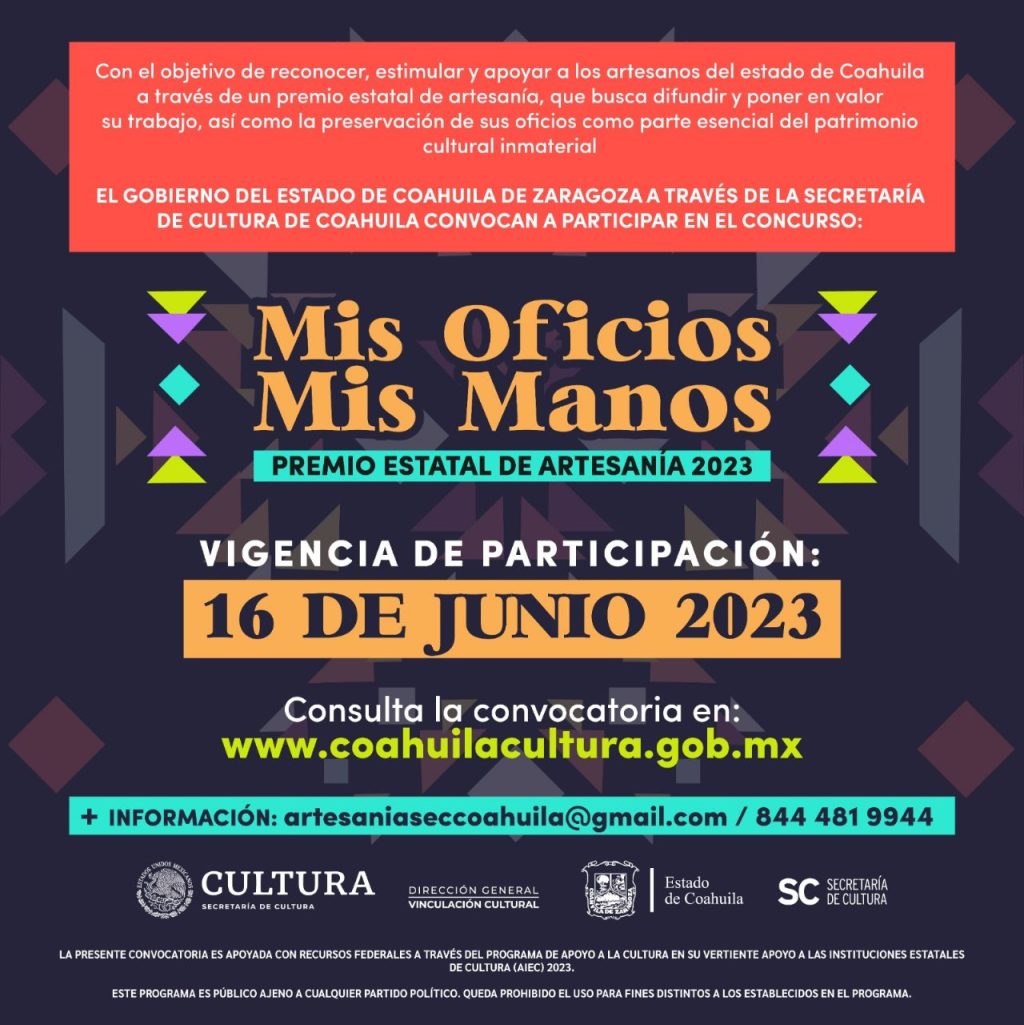 Con el objetivo de reconocer, estimular y apoyar a los artesanos de Coahuila a través de un premio estatal de artesanía, que busca difundir y poner en valor su trabajo, así como la preservación de sus oficios como parte esencial del Patrimonio Cultural Inmaterial, continúa abierta la convocatoria para el concurso “Mis oficios, mis manos: Premio Estatal de Artesanía”.