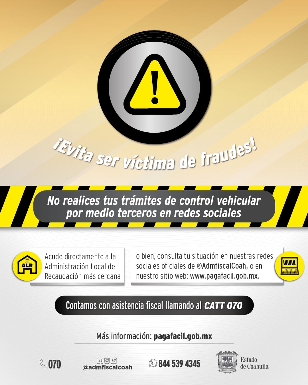 La AFG invita a los coahuilenses que realizarán su trámite de derechos de control vehicular a que no se dejen engañar y eviten ser víctimas de fraudes, al realizarlo por medio de intermediarios.