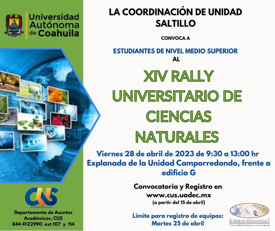 Para promover entre los estudiantes de Educación Media Superior (EMS) el interés por las Ciencias Naturales en una convivencia de paz, igualdad y respeto en armonía con la naturaleza, la Universidad Autónoma de Coahuila a través de la Coordinación de Unidad Saltillo y la Academia de Ciencias Naturales, convoca a participar en el XIV Rally Universitario de Ciencias Naturales, que se llevará a cabo el viernes 28 de abril de 2023.