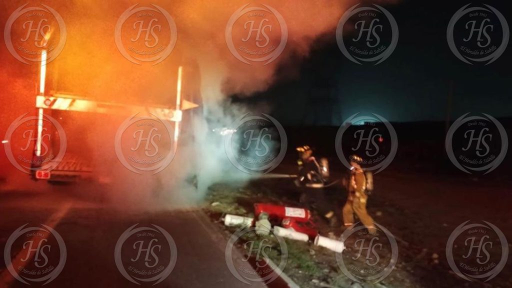 Elementos del cuerpo de Bomberos Ramos Arizpe, fueron los encargados de sofocar las llamas, que consumieron toda una plataforma de la pesada unidad.