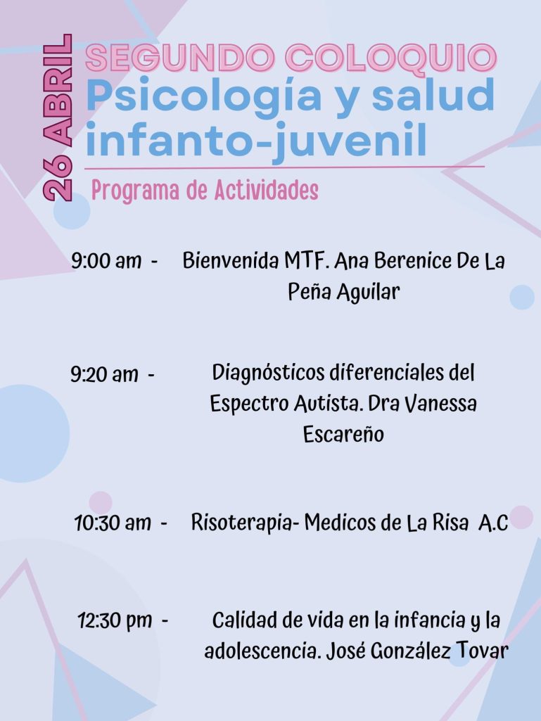 Las actividades iniciarán el 26 de abril a las 9:00 horas con la bienvenida a cargo de la directora del plantel, Ana Berenice de la Peña Aguilar; a las 9:20 se impartirá la conferencia “Diagnósticos diferenciales del espectro autista” por la Dra. Vanessa Escareño.