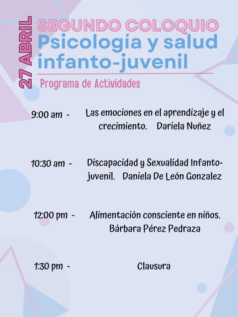 A las 10:30 se contará con la participación de Médicos de la Risa A.C. con “Risoterapia” y a las 12:30 horas se llevará a cabo la conferencia “Calidad de vida en la infancia y la adolescencia” a cargo de José González Tovar; por otro lado, el 27 de abril a las 9:00 horas se impartirá “Las emociones en el aprendizaje y el crecimiento” por Dariela Núñez.