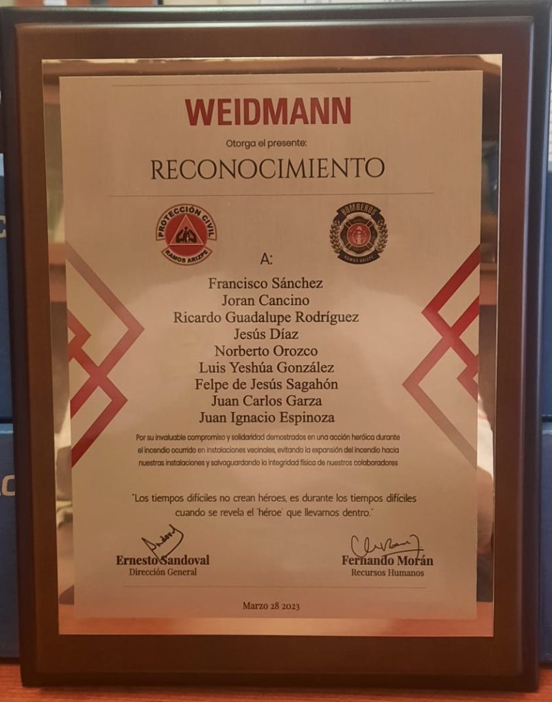 “Por su invaluable compromiso y solidaridad demostrados en una acción heroica durante el siniestro ocurrido en instalaciones vecinas, evitando la expansión del incendio hacia nuestras instalaciones y salvaguardando la integridad física de nuestros colaboradores”, señala la placa que se entregó a manera de reconocimiento en la Estación de Bomberos de esta ciudad.