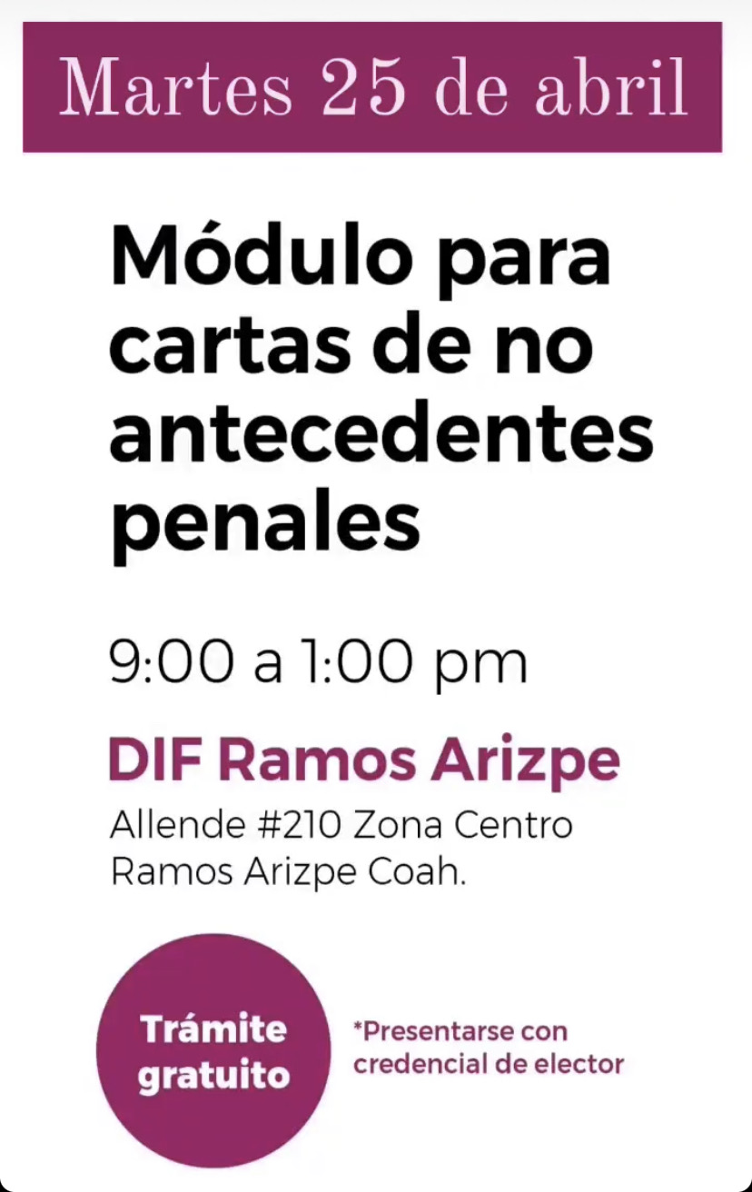 Para apoyar la economía de la ciudadanía, el DIF Ramos Arizpe, a través de la Secretaria de Seguridad Pública del Estado de Coahuila, pondrá en marcha este martes 25 de abril una jornada para realizar el trámite de las cartas de no antecedentes penales de manera gratuita, informó Jorge Gutiérrez Padilla, director de la institución.