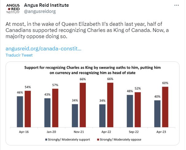 At most, in the wake of Queen Elizabeth II’s death last year, half of Canadians supported recognizing Charles as King of Canada. Now, a majority oppose doing so.https://t.co/OUh7ov4oii pic.twitter.com/kQv4bro1nN