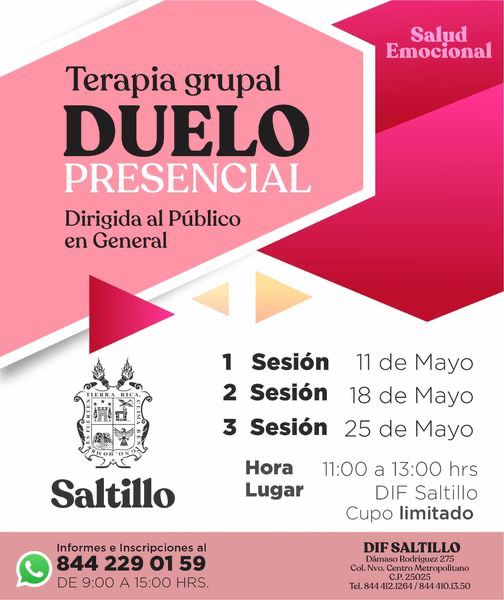 Las sesiones de Terapia Grupal de Duelo son gratuitas y tienen un cupo limitado. Para mayor información e inscripciones pueden comunicarse vía WhatsApp al teléfono 844-229-01-59 de 9:00 de la mañana a 3:00 de la tarde.