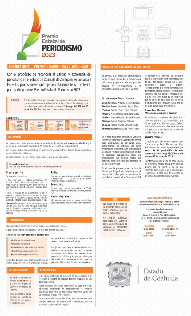 Con el propósito de reconocer la calidad y excelencia del periodismo en el Estado de Coahuila de Zaragoza, se convoca a las y los profesionales que ejercen diariamente su profesión para participar en el Premio Estatal de Periodismo 2023.