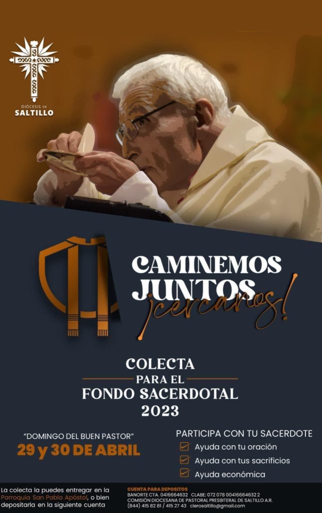 Para apoyar con alimentación, vestimenta, preparación académica, medicamentos y tratamientos médicos a sacerdotes que la integran, los próximos 29 y 30 de abril de este 2023, la Diócesis de Saltillo llevará a cabo su Colecta para el Fondo Sacerdotal 2023.
