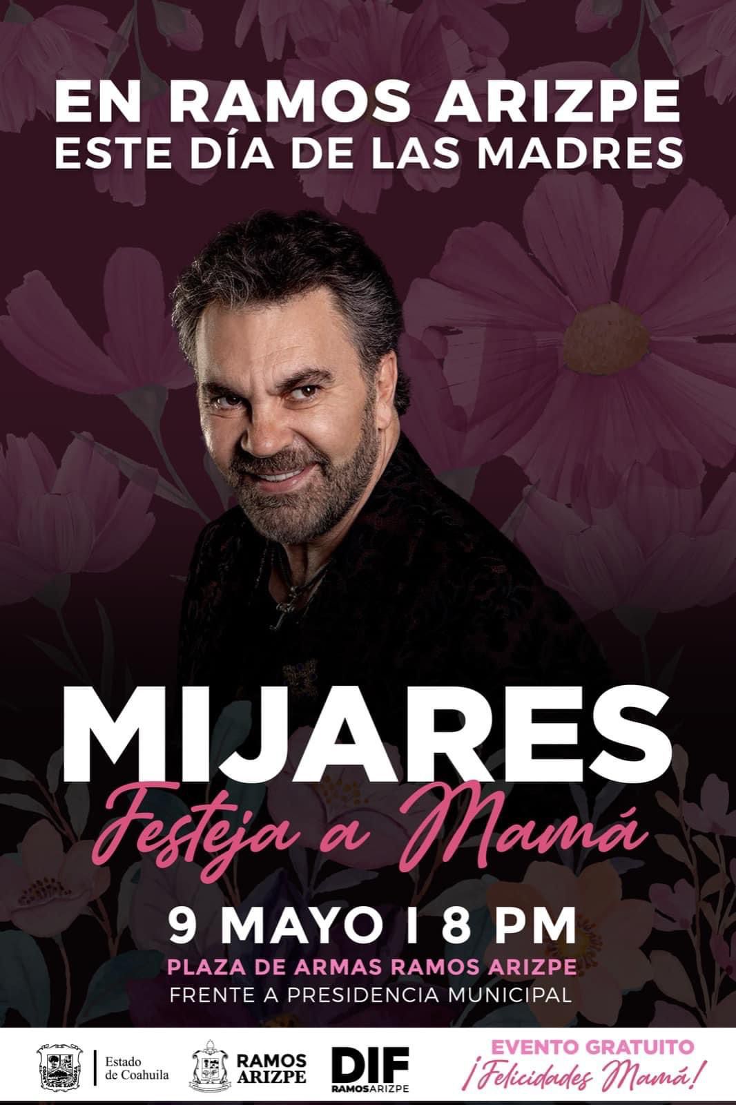 El alcalde de Ramos Arizpe, Chema Morales confirmó que el cantante y compositor Mijares se presentará en la ciudad en el marco del día de las madres, evento completamente gratuito que se llevará a cabo el próximo 9 de mayo en la plaza principal frente a la Presidencia Municipal en punto de las 20:00 horas.