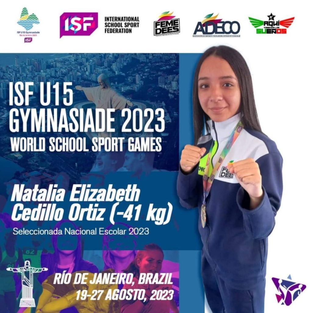 Además, Natalia Elizabeth Cedillo Ortíz participará en la disciplina del Taekwondo en la División de -41 Kilos, dentro de los Juegos Mundiales Escolares Sub-15, a realizarse en Río de Janeiro, Brasil, del 19 al 27 de agosto.