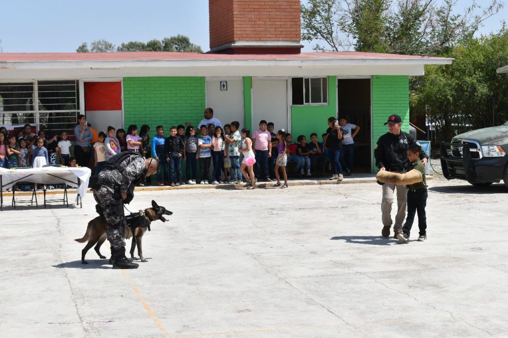 Alumnos de la Escuela Primaria “Emilio Carranza” y del Jardín de Niños “Venustiano Carranza” presenciaron, además, la demostración de los binomios caninos K9 del municipio de Ramos Arizpe y del Estado, entrenados para la detección de drogas y explosivos.