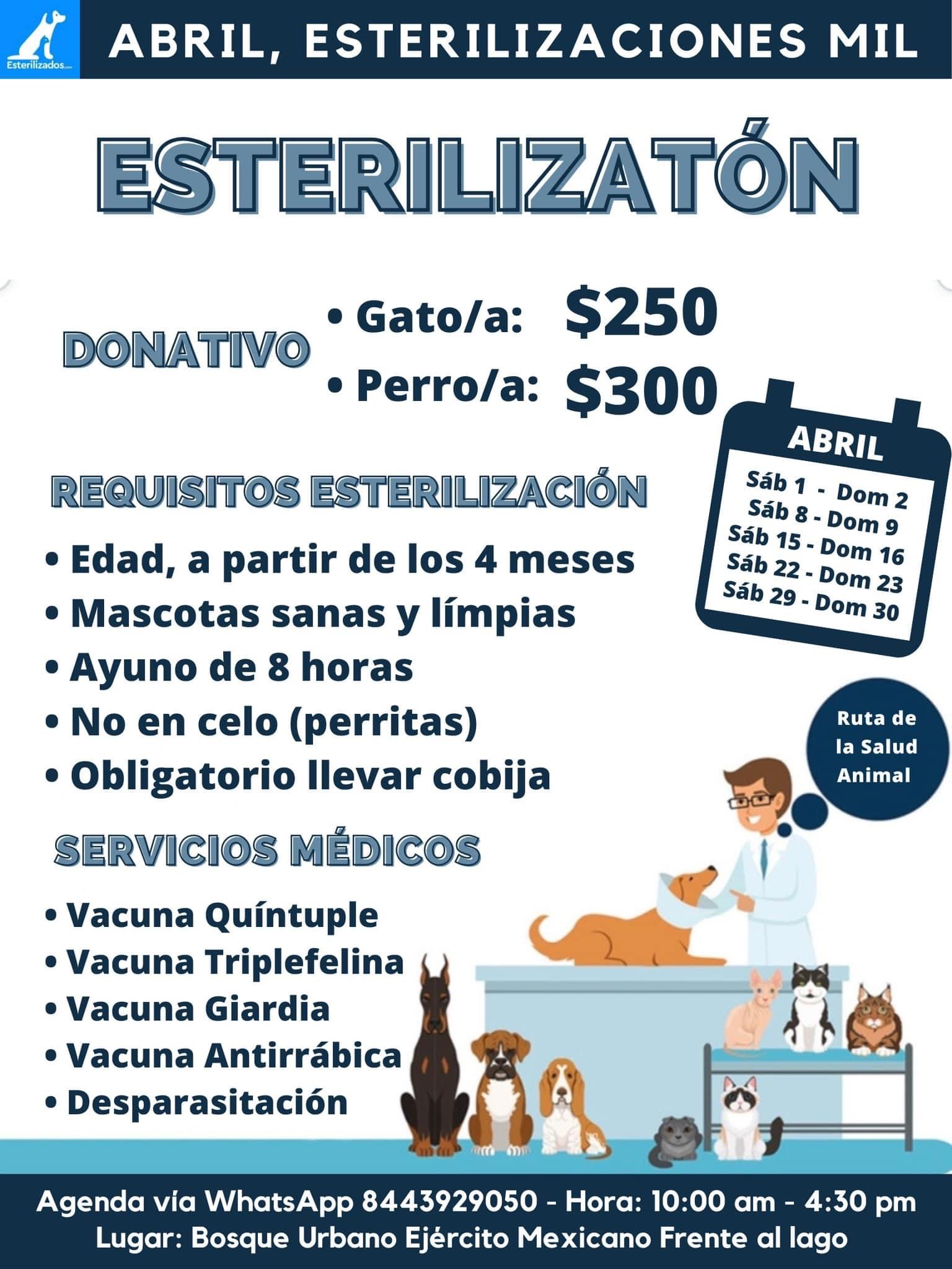 Esterilizados A.C. en conjunto con el Municipio de Saltillo, invitan este domingo 30 de abril al último día de la jornada mensual que lleva a cabo la asociación civil protectora de animales durante el mes de abril, lo anterior con la finalidad de esterilizar a los animales de compañía, principalmente perros y gatos evitando la sobrepoblación, así como fomentar el cuidado adecuado de estos mamíferos.
