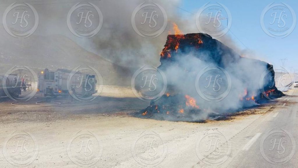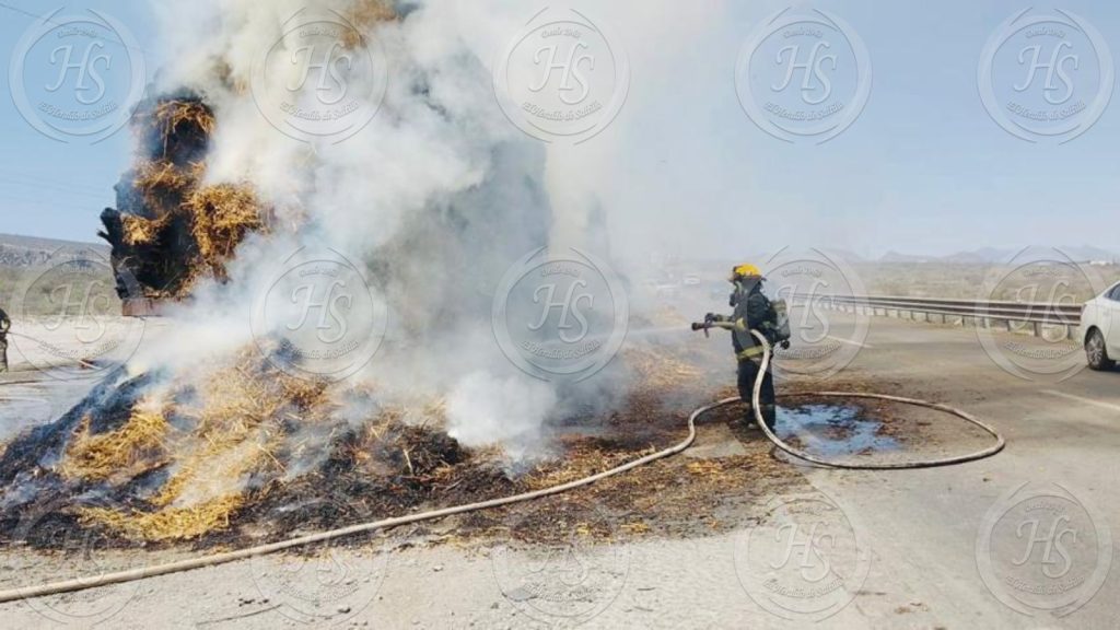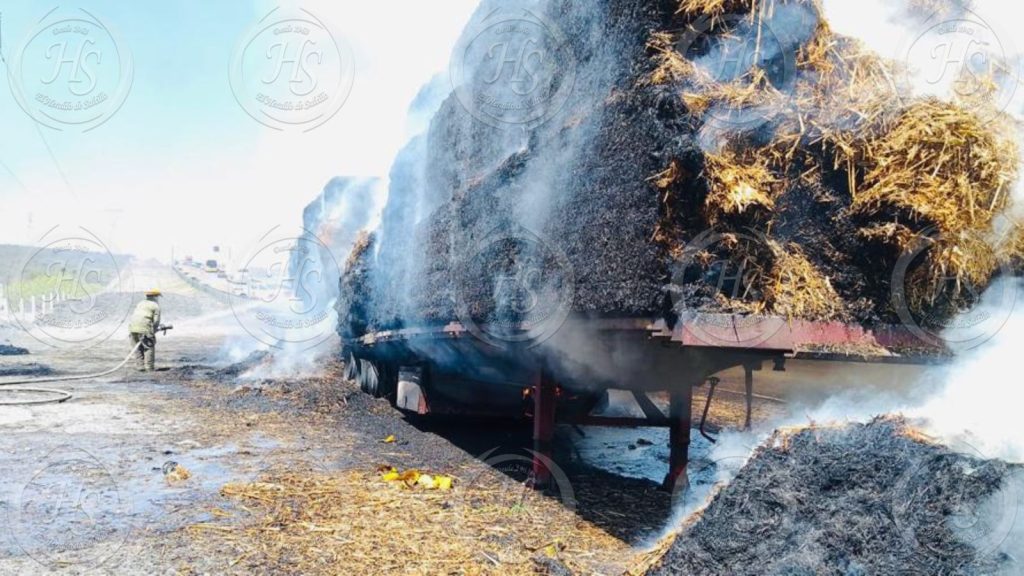 Un voraz incendio se registró en dos remolques de un tractocamión que transportaba una cantidad importante de pacas de alimento para ganado.