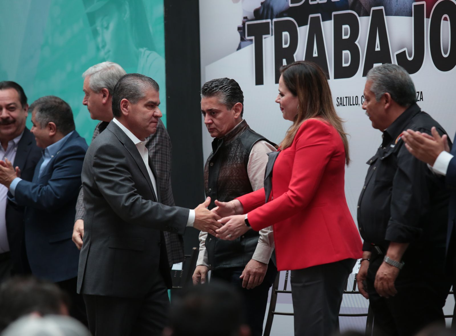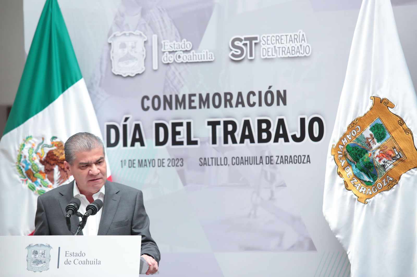 Acompañado por líderes de organismos gremiales, como Tereso Medina Ramírez, de la CTM; Felipe Vázquez Tamez, de la Federación Nacional de Sindicatos Independientes; José Alberto Morales Núñez, de la CROC; y José Reyes Blanco, de la CROM; además de los titulares de los Poderes Legislativo y Judicial, diputados federales, el titular de organismos empresariales Coahuila Sureste, y el Alcalde de Saltillo, Riquelme Solís mencionó que en su Administración, en mutua y respetuosa colaboración entre los Poderes del Estado, se propugna por defender los legítimos derechos de las y los trabajadores; por responder a sus justas demandas; impulsar el desarrollo de sus capacidades productivas y garantizar oportunidades laborales para todas y todos.