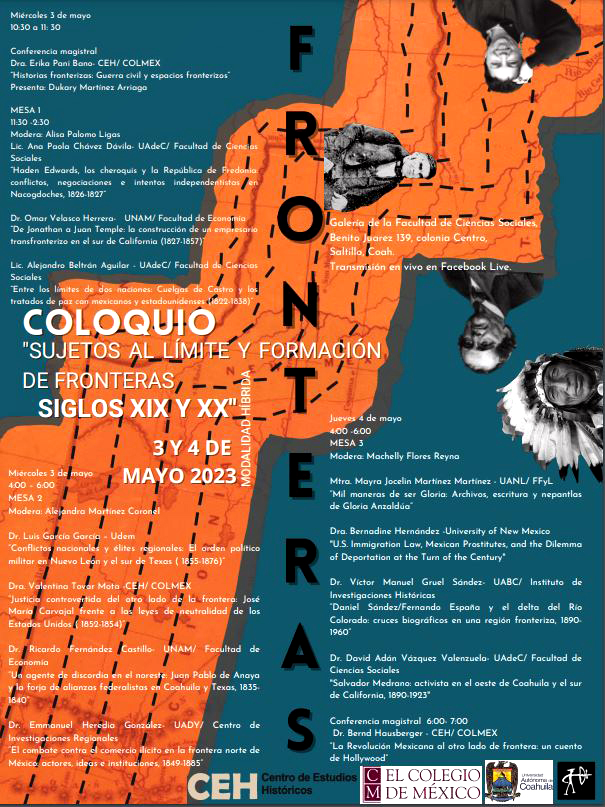 La Facultad de Ciencias Sociales de la Universidad Autónoma de Coahuila en colaboración con El Colegio de México A.C. (COLMEX) invitan a comunidad universitaria y público en general al Coloquio “Sujetos al límite y formación de fronteras, siglos XIX y XX” que se llevará a cabo el 3 y 4 de mayo en las instalaciones del Centro Cultural Vito Alessio Robles, ubicado en Hidalgo s/n y Aldama, Centro Histórico de Saltillo.