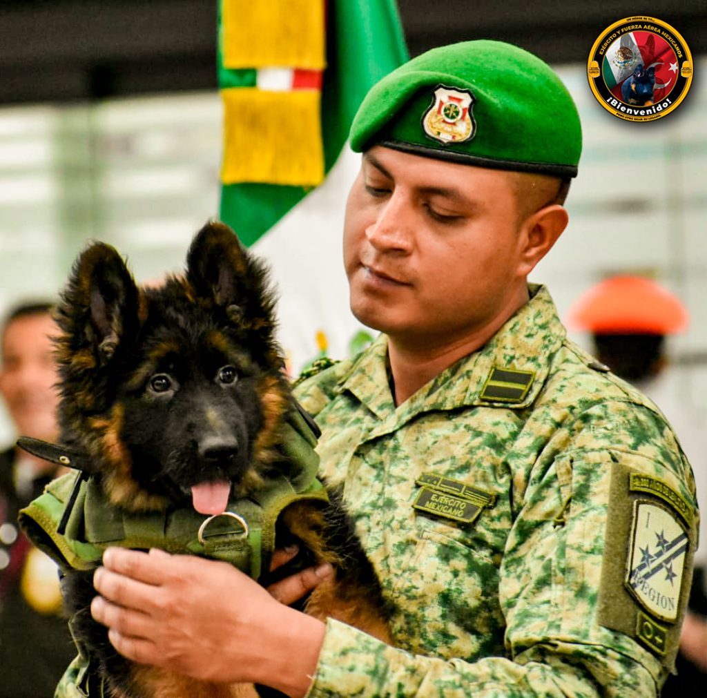 A su llegada aguardaron elementos de la Sedena y cachorros que, como él, serán adiestrados para formar parte de los binomios caninos mexicanos.