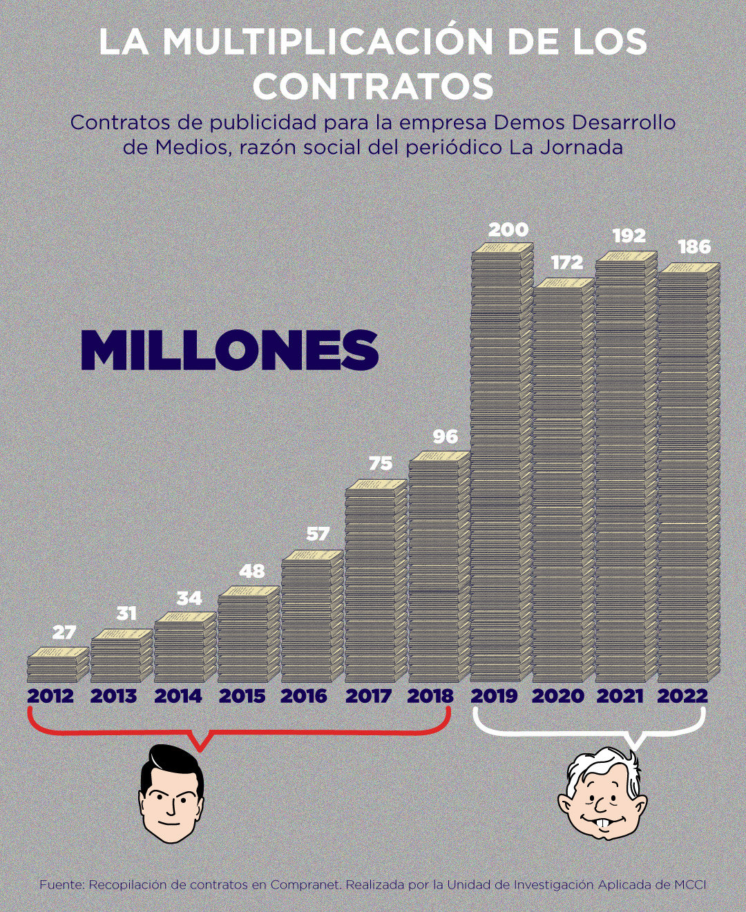 En todo el sexenio de Peña los contratos a La Jornada sumaron 368 millones de pesos, mientras que entre 2019 y 2022 el monto asciende a 750 millones de pesos.